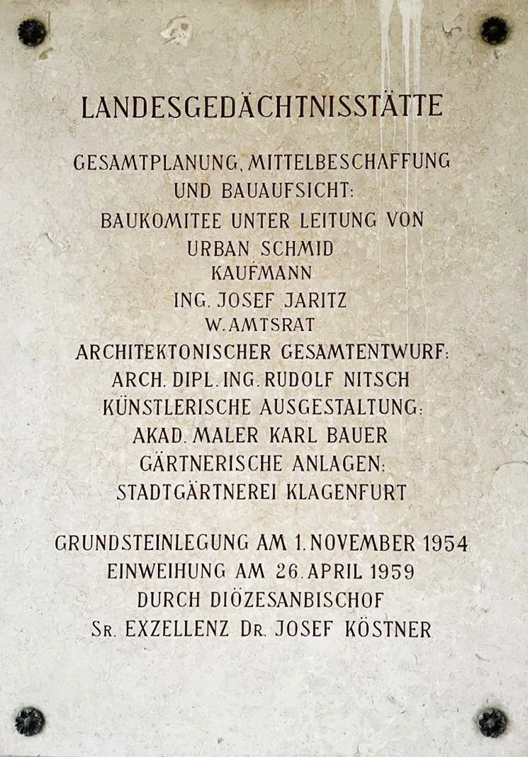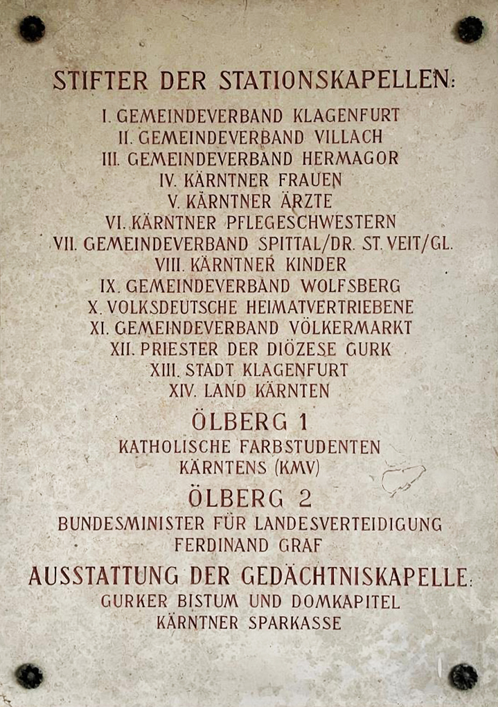 After World War II, it was decided to transform the existing Calvary site at Kreuzbergl in Klagenfurt into a national memorial, which was inaugurated in 1959. The artist Karl Bauer was chosen for the task, taking on the responsibility of symbolically linking the Stations of the Cross with the atrocities of war to serve as a solemn reminder. Each station, in addition to its traditional Christian significance, is also dedicated to the victims of war and was sponsored by a corresponding group. At the foot of the site, the stations begin with the four Evangelists. Before the actual Stations of the Cross, two stations depicting the Garden of Gethsemane were added, and the Way of the Cross concludes in the memorial chapel with a depiction of the Resurrection.